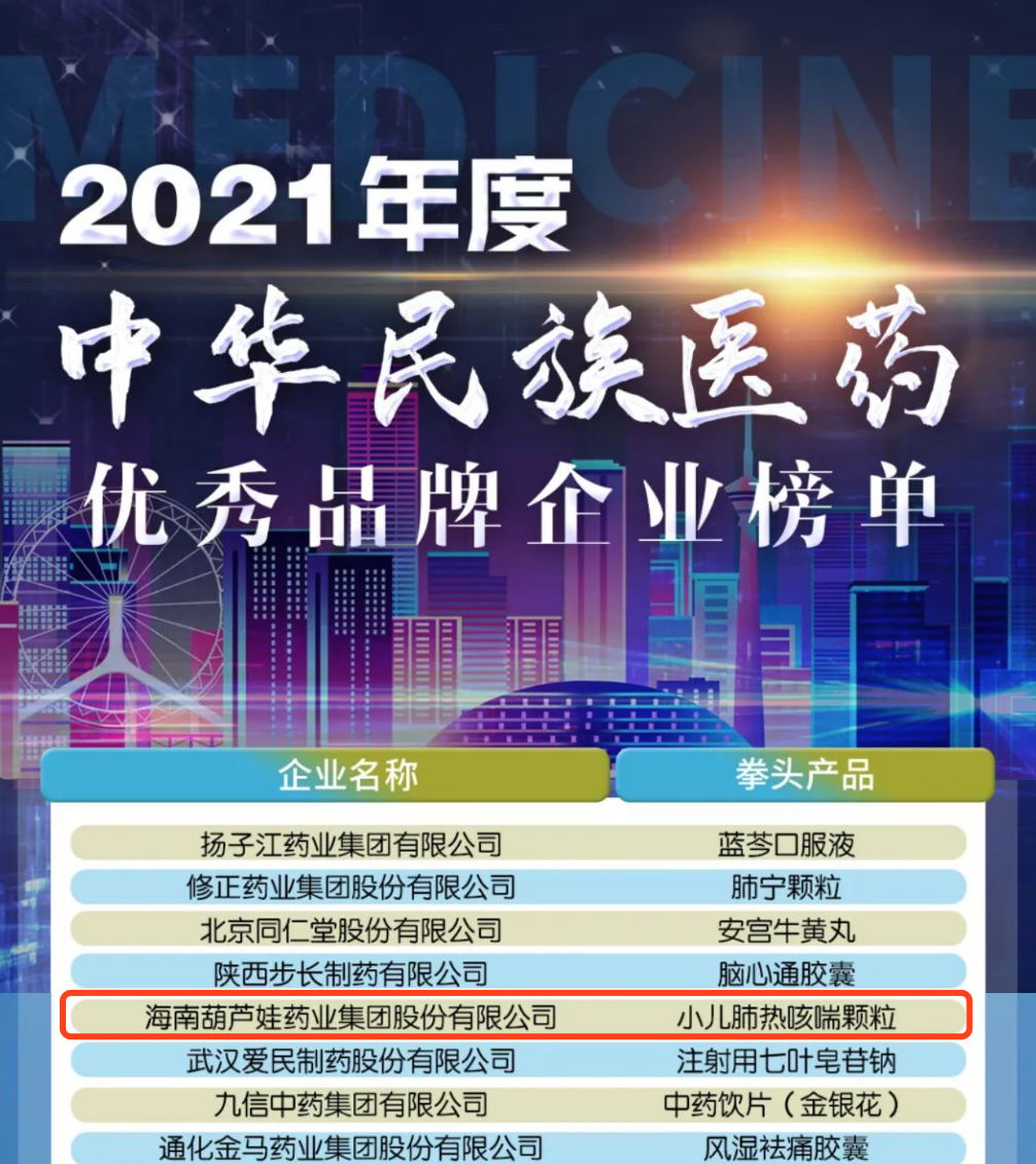 12月29日,全国工商联医药业商会发布了“2021年度中华民族医药优秀品牌企业榜单”,PG药业集团凭借黄金单品小儿肺热咳喘颗粒(4克)实力登榜。